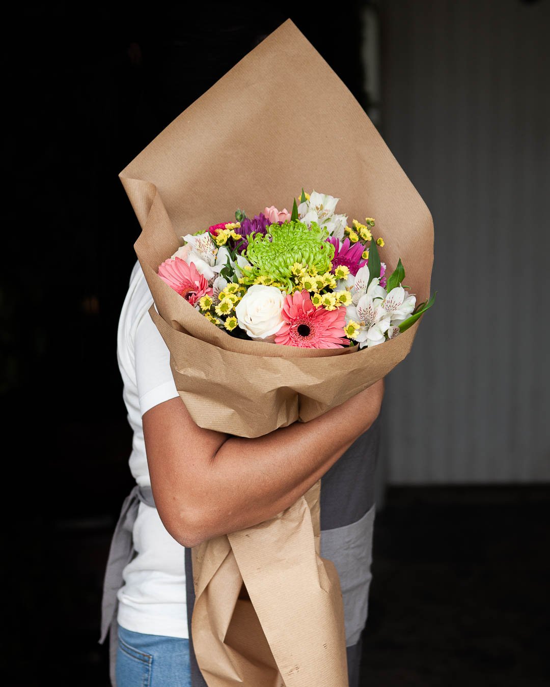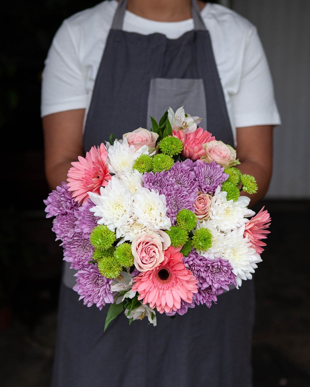 Un ramo armado en el momento de colores pasteles realizado con flores de estación blanco, rosa, fucsia y verde similar al de las fotos. Este ramo de diseño compacto no dejará de alegrar a quien lo reciba.