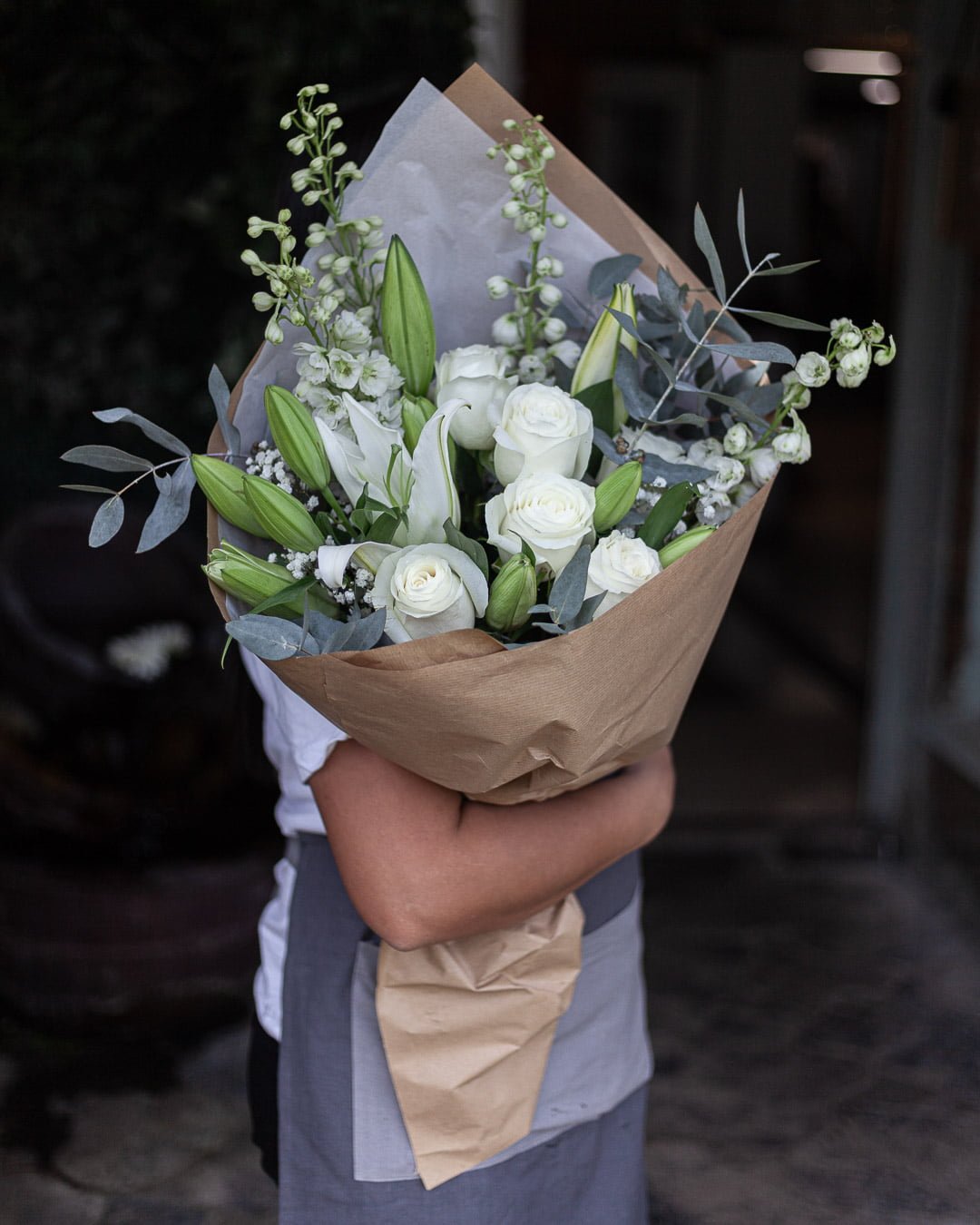 No solo las novias llevan blanco. Este ramillete elegante en tonos blancos combina con los aires de mar.